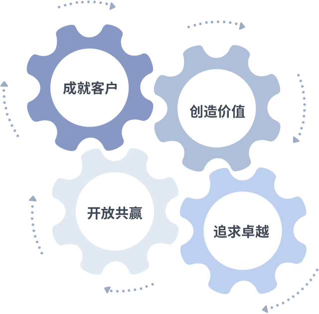 成就客户是一切决策的出发点,,创造价值是衡量所有工作的标准,,,,追求卓越是我们做事做人的态度,,开放共赢是我们的格局也是最终的结果。。。价值观的齿轮环环相扣,,,,推动着组织里的每个人不断向前。。。。